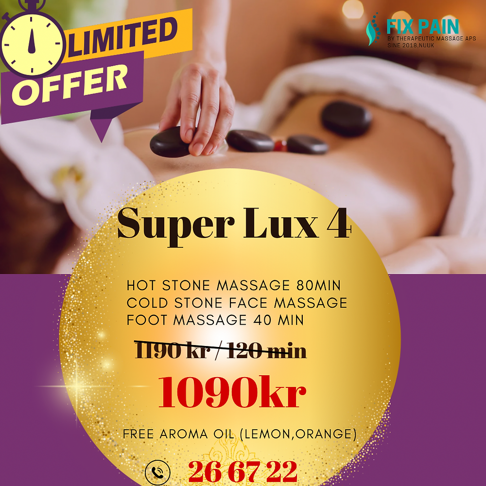 990 Danish kronerHot Stone 60min,Stone facial masasge 10 min ,Foot Masasge 30 min or Suana 20 min.